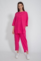 Женский костюм, состоящий из жакета, брюк и топа, выполнен из мягкой струящейся ткани. Удлиненный жакет без подкладки с функциональными карманами по переду и рукавами "летучая мышь". Брюки прямого силуэта с притачным поясом на резинке по бокам, в боковых швах карманы с отрезным бочком, застежка на молнию, петлю и пуговицу. Базовый топ выполнен из мягкой струящейся ткани, рукава со спущенной линией плеча.