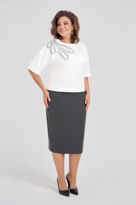 Женский костюм, состоящий из джемпера и юбки, выполнен из мягкого трикотажа, который держит форму. Джемпер свободного силуэта с цельнокроенными рукавами и застежкой-молнией по спинке. Джемпер дополнен дизайнерской вышивкой по переду и спинке. Классическая юбка-карандаш на трикотажной подкладке с завышенной линией талии, на обтачке, застегивается на молнию и имеет сзади шлицу.