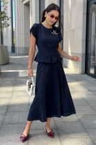 Костюм женский полуприлегающего силуэта выполнен из облегченной костюмной ткани с небольшим содержанием стрейча и состоит из жакета и юбки. Жакет без подкладки со втачными рукавами, рубашечным воротником, застежкой-планкой на петли и пуговицы. По воротнику, низу рукавов и жакета вставлена оборка из той же ткани белого цвета. Юбка полуприлегающего силуэта на хлопковой подкладке заужена к низу, пояс притачной с резинками в боковых швах  и застежкой на тесьму-молнию и пуговицу. Костюм прошел тестовую стирку при температуре 30 градусов ( не линяет). Изделие соответствует размеру.