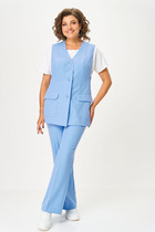 Костюм женский, состоящий из туники и брюк, выполнен из легкой струщейся ткани. Туника свободного силуэта, низ изделия ассиметричнной формы с накладным фукциональным карманом, спинка с акцентным треугольным вырезом. Брюки классические полуприлегающего силуэта заужены к низу, в боковых швах функциональные карманы, пояс притачной полностью на резинке. Костюм полностью соответсвтует заявленному размеру.