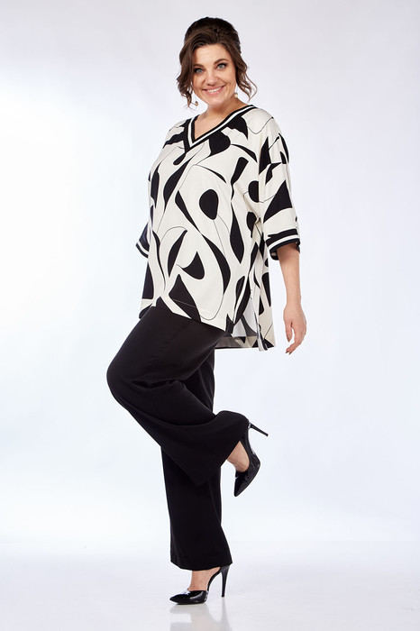 Комплект брючный, состоит из туники и брюк. Туника свободного силуэта из вискозной ткани. Горловина V-образной формы. По низу рукавов и горловине вставлен довяз. Рукава-цельнокроенные. В боковых швах внизу блузы обработаны разрезы. Брюки средней посадки прямые. В передних деталях брюк расположены карманы. Пояс на резинке.