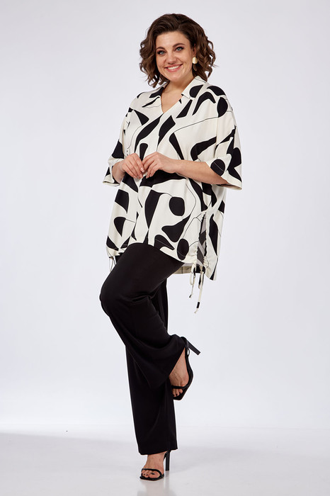 Комплект брючный, состоит из туники и брюк. Туника свободного силуэта из вискозной ткани. Горловина оформлена воротником, спереди фигурный вырез. Рукава цельнокроеные. В боковых швах внизу обработаны высокие разрезы со стяжкой. Брюки средней посадки, прямые. В передних деталях брюк расположены карманы. Пояс на резинке.