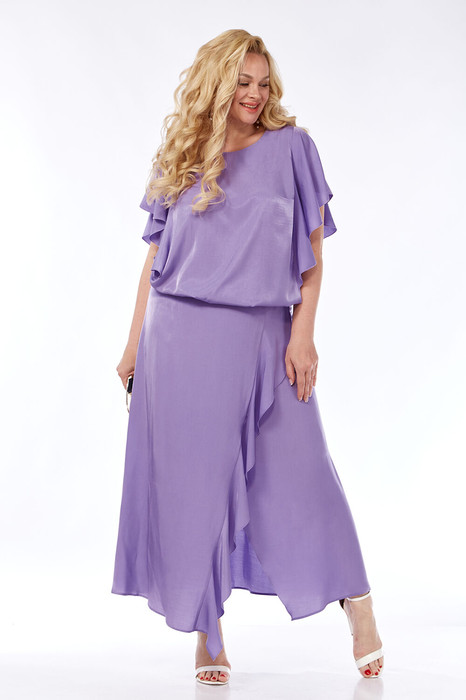 Костюм женский нарядный, выполнен из легкой натуральной ткани. Состоит из блузки свободного силуэта и юбки А-силуэта. Горловина блузки округлой формы. По переду и спинке рельефы которые оформлены воланами переходящими в рукава крылышки. На спинке вырез-капля. Низ блузки на резинке. Юбка с запахом дополнена воланом. Пояс притачной на резинке. Юбка на подкладке.