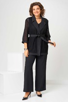Костюм женский брючный двухпредметный, состоит из джемпера и брюк, свободного силуэта. Выполнен из трикотажного полотна. С отделкой из экокожи. Джемпер с округлой горловиной которая обработана планкой. По переду нагрудный накладной карман с клапаном. Спинка с кокеткой и планкой по центру дополнены пуговицами. Рукава спущенные, с лампасами. Низ джемпера обработан планкой из отделочной ткани. По боковым швам разрезы. Брюки прямые, с притачным поясом на эластичной тесьме. По передним частям брюк обработаны карманы с отрезным бочком. Костюм декорирован вышивкой.