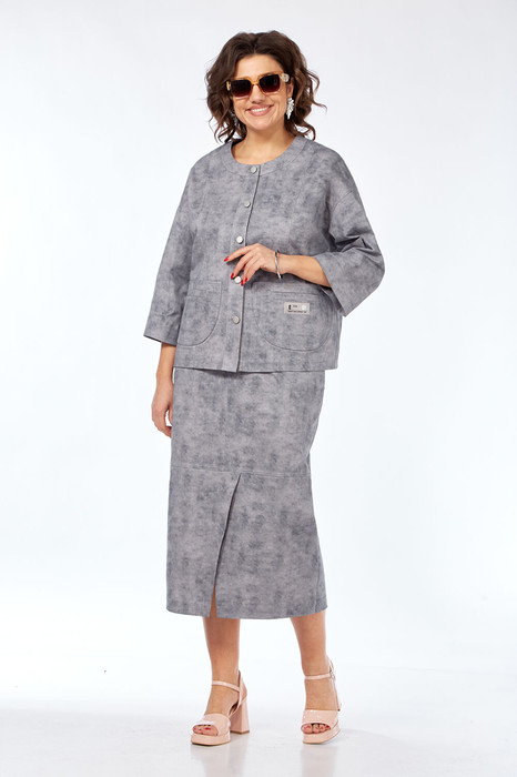 Костюм женский 2х-предметный, состоит из жакета и юбки, выполнен из хлопковой костюмной ткани. Жакет прямого силуэта, с центральной бортовой застежкой на петли и джинсовые пуговицы. Горловина округлой формы с отрезной обтачкой. По переду обработаны рельефы и накладные детали фигурной формы, в которых выполнены карманы. На спинке обработаны рельефы и кокетка. Рукава спущенные, с широкой подгибкой низа. Изделие дополнено по спинке дизайнерской вышивкой. Юбка прямого силуэта с притачным поясом, с застежкой на петлю с пуговицей и молнию. Передние и задние детали юбки разрезные. По переду обработаны боковые карманы.