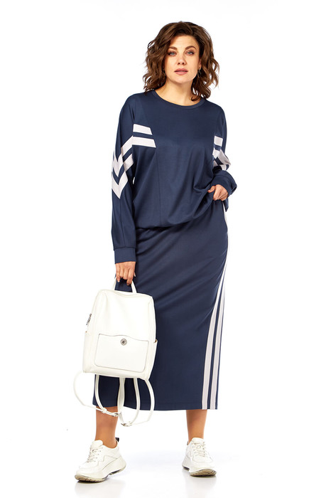 Костюм женский юбочный, состоит из джемпера и юбки. Выполнен из трикотажного полотна. Джемпер разрезной, со вставками из отделочной ткани. Горловина круглой формы. Рукава “летучая мышь”, внизу на манжетах. По низу джемпера кулиса со шнуром-резинкой и фиксаторами. Юбка заужена к низу. Пояс частично на резинке. По боковым швам декоративные вставки-лампасы. В юбке обработаны карманы. На задней части средний шов с разрезом внизу. Юбка на подкладке.