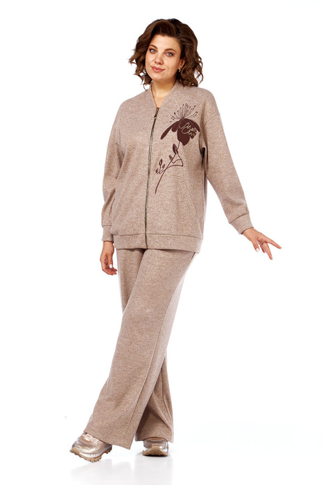 Костюм брючный, повседневный, состоит из бомбера и брюк. Выполнен из трикотажного полотна. Бомбер свободного силуэта, горловина обработана стойкой, застежка центральная на тесьму-молнию. По переду обработаны прорезные карманы с листочкой. Спинка на кокетке. По низу бомбера притачной пояс. Рукава спущенные по низу на манжетах. Изделие дополнено дизайнерской вышивкой. Брюки прямого силуэта с притачным поясом на эластичной тесьме , со шнуром. В передних деталях брюк обработаны карманы.