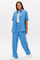 Костюм брючный, двухпредметный, состоит из блузы и брюк. Выполнен из ткани с эффектом крэша. Блуза свободного силуэта с горловиной V-образной формы и стояче-отложным воротником. По переду обработана односторонняя складка с имитацией застежки. Спинка с фигурными подрезами, в районе талии, по центру кулиса присобранная на эластичную тесьму. Рукава спущенные. Блуза декорирована дизайнерской вышивкой. Брюки прямого кроя, классической посадки. Пояс притачной на эластичной тесьме. В передних деталях брюк обработаны карманы с подрезным бочком.