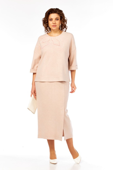 Костюм женский нарядно-повседневный, состоит из джемпера и юбки, выполнен из трикотажного полотна. Джемпер прямого силуэта. Перед цельнокроеный, дополнен дизайнерской вышивкой. Спинка с застежкой на декоративную тесьму-молнию. Горловина округлой формы. Рукава спущенные. Юбка заужена к низу. Пояс цельнокроеный на эластичной тесьме. По переду обработан ассиметричный рельеф, в котором имеется шлица. Юбка на подкладке.