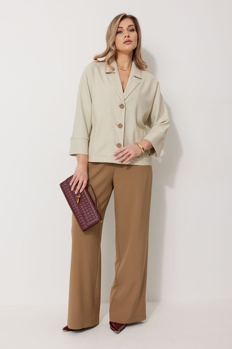 Костюм женский, состоящий из жакета и брюк. Жакет без подкладки, кроя «летучая мышь», с центральной однобортной застежкой на петли и пуговицы. По переду обработаны вертикальные прорезные карманы с листочкой. Спинка цельнокроеная. Горловина V-образной формы, обработана воротником пиджачного типа с контрастным кантом. Рукав 7/8, по низу обработан широкой притачной манжетой. Брюки женские, прямого силуэта. По переду  заложены складки и обработана застежка на молнию. Карманы расположены в боковом шве.  На задних половинках брюк застрочены вытачки. Верх обработан широким притачным поясом (частично на резинке), застегивающимся на петлю и пуговицу.