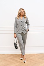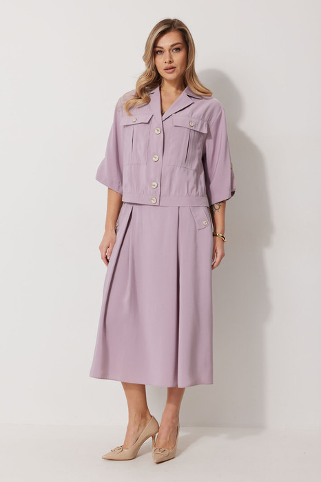 Костюм женский, состоящий из жакета и юбки. Жакет прямого силуэта без подкладки, длиной до линии бедра. По переду жакета настрочены накладные карманы с встречными складками. В шве притачивания кокетки расположен клапан кармана, застегивающийся на петлю и пуговицу. В среднем шве спинки расположена встречная складка. Рукав втачной одношовный, прямой. По низу рукава расположена пата, застегивающаяся на петлю и пуговицу. По низу жакета обработан отрезной пояс. Горловина обработана втачным воротником с лацканами. Застежка центральная , однобортная на петли пуговицы. Юбка женская на подкладке  А – силуэта длиной до середины икры. По переду юбки заложены встречные складки и нстрочены клапаны  с декоративными пуговицами. Спинка юбки цельная. Карманы обработаны в боковом шве юбки. По левому боковому шву юбки находится застежка – молния.  Верхний срез юбки обработан притачным поясом с резинкой по спинке.