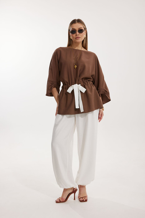 Блуза кроя «летучая мышь» длиной за линию бедра.  Перед цельный с округлой горловиной. Спинка со средним швом. В районе талии обработана кулиса с широким контрастным поясом. По низу рукава  по передней части выполнено несколько рядов сборки. Горловина обработана окантовкой.