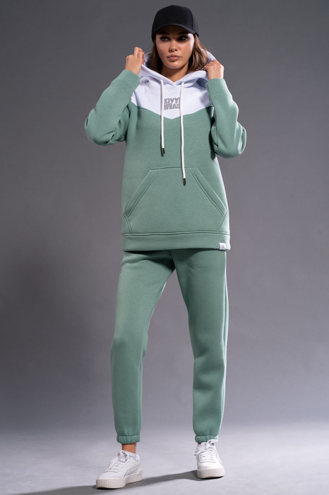 Худи с двухцветным дизайном привлекает внимание благодаря отделочной кокетке. Она добавляет неповторимости и стиля этому утепленному комплекту.