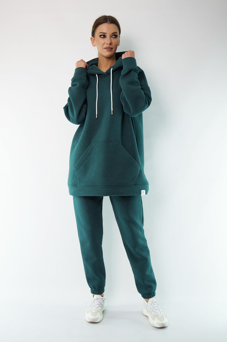 Костюм ОВЕРСАЙСЗ утепленный на флисе. Удлиненная худи Оверсайз модели 4054 с капюшоном на подкладке из основной ткани. Брюки модели 4053 средней посадки зауженные к низу с карманами в боковых швах. Обработка низа брюк резинка. Ткань футер (3-х ниточный) с внутренним слоем утепленным начесом, качество Пенье, плотность 395 г.м2