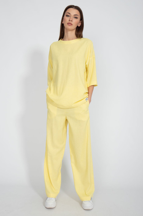 Костюм состоящий из брюк прямого свободного кроя с карманами в боковых швах и джемпера свободного кроя. С приспущенным рукавом и кулиской по низу изделия с возможностью регулировки ширины низа.  Ткань лен. Отлично сочетается с шортами модели 4074, рубашкой 4073, рубашкой 4081, джоггерами 4082.