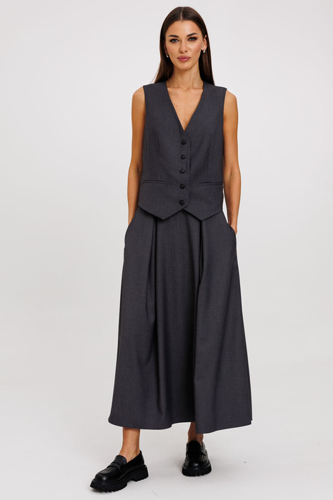 Этот эксклюзивный костюм, состоящий из классического жилета с пятью пуговицами и прорезными карманами и удлиненной юбки-трапеции из костюмной ткани с боковыми карманами и изящными встречными складками, — идеальное сочетание элегантности и практичности. Жилет, украшенный пуговицами, добавляет нотку аристократической изысканности, а карманы делают его не только стильным, но и удобным. Юбка-трапеция    создает утонченный и женственный образ, в то время как карманы и складки добавляют элемент загадочности и шарма. Этот костюм — воплощение времени и моды, которое будет привлекать восхищенные взгляды и вызывать восхищение своим утонченным стилем и вниманием к деталям.