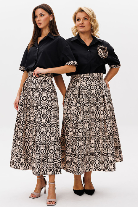 Костюм из двух элементов: блуза свободного кроя с декоративным цветком + хлопковая юбка с встречными складками — идеальный гармоничный ансамбль, сочетающий женственность, комфорт и актуальный дизайн.