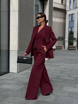 Комплект женский (жакет и брюки). Жакет женский, свободного силуэта,  на подкладке, длиной ниже линии бедер, с втачными рукавами, с центральной сквозной застежкой на 2 петли и 2 пуговицы до линии перегиба лацкана. Детали переда жакета с отрезными бочками, которые заканчиваются разрезами, горизонтально расположенными боковыми клапанами, и талиевыми вытачками. Деталь спинки жакета с рельефными швами и со средним швом, который заканчивается шлицей. Рукава втачные двухшовные, с передним и локтевым швами, внизу передних швов обработана шлица с застежкой на 2 петли и 2 пуговицы. Воротник отложной пиджачного типа. Углы воротника и лацканов острые. Края воротника, лацкана, борта, клапанов обработаны в чистый край. Жакет с притачной понизу подкладкой.