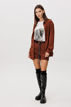 Туника длиной ниже линии бедер создает эффект легкости и элегантности, а асимметричный низ добавляет оригинальности. Округлый вырез горловины обработан аккуратной обтачкой. Застежка центральная на петли и пуговицы. По полочке выполнен горизонтальный подрез на уровне талии, от которого идет кружевная вставка, что визуально стройнит и придает образу утонченность. Туника с цельнокроеными рукавами, которые снизу собраны на широкую резинку. Спинка со средним швом и разрезом добавляет нотку игривости.