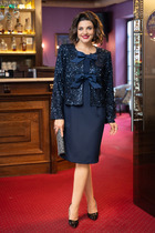 Жакет женский ИЗ КОСТЮМНОЙ ТКАНИ ТЕМНО СИНЕГО ЦВЕТА, прилегающего силуэта, на подкладке, длиной ниже линии бедер, с втачными рукавами, с центральной сквозной двубортной застежкой на 2 петли и 2 пуговицы и 1 потайную петлю и пуговицу до линии перегиба лацкана (и 2 декоративные), со съемным поясом. Детали переда жакета с отрезными бочками, центральные части с нагрудными вытачками, на боковых частях вертикально расположены прорезные карманы с листочками. Деталь спинки жакета с плечевыми вытачками, с рельефными швами и со средним швом. Рукава втачные двухшовные, с передним и локтевым швами, внизу локтевых швов оформлен декоративный элемент из двух кнопок и отделочной строчки. Воротник отложной пиджачного типа. Углы воротника и лацканов острые. Края воротника, лацкана, борта, клапанов обработаны в чистый край. Жакет с притачной понизу подкладкой. Низ жакет фигурной формы.