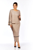 Юбка-карандаш на подкладке, чуть зауженная к низу. В среднем шве расположены потайная молния и открытый разрез. На линии талии расположены классические вытачки, пояс внутренний, обтачной. Длина изделия по среднему 70 см.
