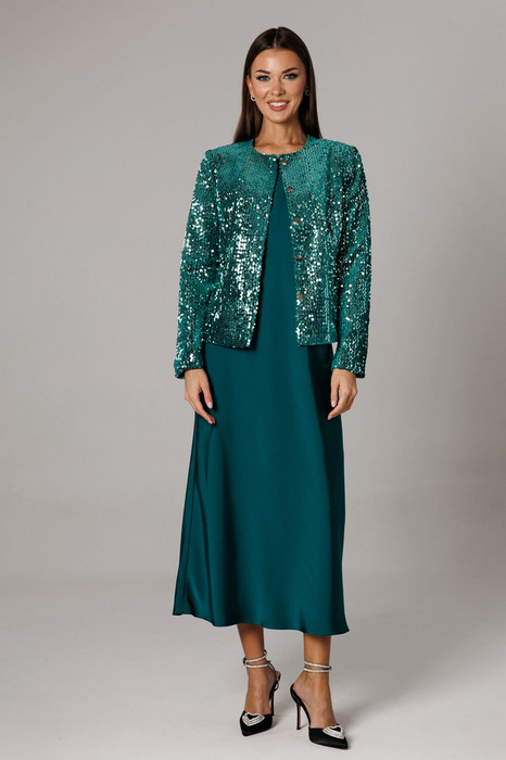 Жакет полуоблегающего силуэта с притачными рельефными бочками на спинке, полочке из эффектной ткани с пайетками. Застежка фронтально-вертикальная на скрытую кнопочную систему. Рукав втачной двухшовный. Длина жакета по спинке 54- 55 см, длина рукава 61-62 см. Горловина округлой формы.