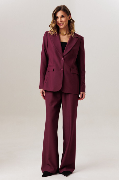 Стильный гармоничный комплект в стиле умеренного оверсайза, состоящий из свободного жакета и широких брюк. Эффектной деталью комплекта выступает высокая открытая шлица на спинке жакета, закрепленная пуговицами.