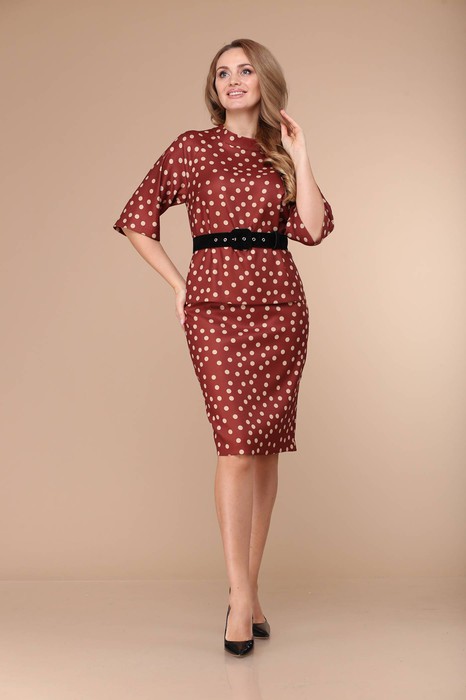 Комплект юбочный, состоящий из юбки и блузона . Юбка прилегающего силуэта, зауженная к низу, по среднему шву потайная застёжка-молния, в низу разрез. Верхний край юбка обработан обтачкой. Юбка на подкладке. Длина юбки по боковому шву -63 см. Блузон прилегающего  силуэта , слегка расклешён к низу, с нагрудными вытачками на полочке. Спинка со средним швом . В среднем шве спинки потайная застёжка-молния. Длина по спинке -56,5 см. Горловина обработана стойкой-воронкой, высотой -3,5 см. Рукав - реглан, слегка расклешён  к низу. Длина рукава-41,5 см. Декоративный съёмный пояс подчёркивает изящество фигуры.