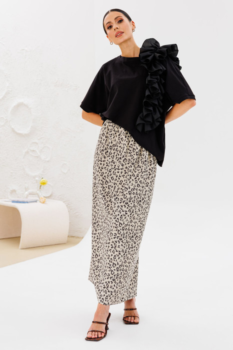 Юбка комплекта прямого силуэта. Пояс на декоративной эластичной тесьме, шириной 5,5 см. В среднем шве юбки расположен открытый размер, высотой 38 см.