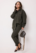 Брюки комплекта созданы в свободном стиле палаццо. В пояс брюк по спинке вставлена эластичная тесьма, шириной 3 см. Спереди пояс фиксируется горизонтально на петли/пуговицы и вертикалную закрытую клапан-молнию (гульфик).
