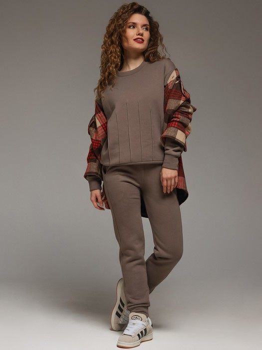 Костюм молодежный из гладкокрашеного трикотажного полотна «футер- трехнитка», состоящий из джемпера и брюк овальной формы, обработанной втачной планкой и притачным поясом по низу. Рукава – с притачными манжетами. Манжеты, планка горловины и пояс выполнены из полотна «кашкорсе» такого же цвета, как и основной материал. На полочке застрочены декоративные складочки-защипы, расположенные симметрично относительно линии центра. Брюки – длинные, на притачном поясе с эластичной тесьмой внутри и манжетами по низу. Передние половины – из двух частей каждая, со смещением соединтельных швов в сторону боковых срезов. Соединительные швы передних половин обработаны с карманами. Пояс и манжеты выполнены из трикотажного полотна «кашкорсе».