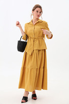 Жакет свободного силуэта, с округлым вырезом горловины. Застежка центральная на петли и пуговицы. Плечевой пояс спущенный, рукав полной длины по низу предусмотрен манжет с застежкой. По полочке расположены продольные рельефы с карманами в шве. В комплект входят брюки по типу джинс, с завышенной посадкой. По переду расположены карманы. Застежка – брючная тесьма-молния с обработанным гульфиком. Брюки прямого кроя. Сзади расположены накладные карманы. Для более комфортного прилегания по спинке в пояс вставлена резинка. Отличный костюм для сезона весна-лето в размере плюс-сайз!