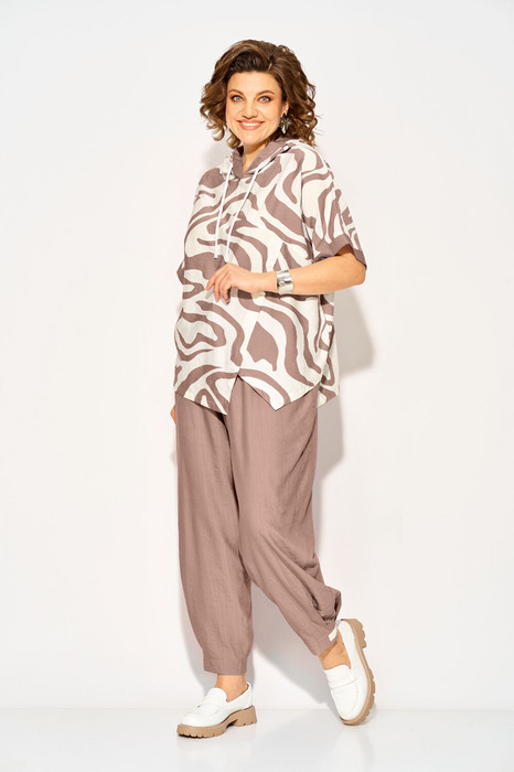 Стильный летний костюм, состоящий из удлиненной туники свободного покроя и брюк. Оригинальная туника из вискозы добавлением льна. Модель с цельнокроеным укороченным рукавом и ассиметричным подрезом по полочке. Модель с легким капюшоном и кулисой на шнуровке. Низ изделия разноуровневый. Спинка цельная. В комплекте свободные брючки, завышенной посадки. Брюки на притачном поясе с круговой резинкой. Имеются боковые карманы. Низ с заложенными складками, что придает изделию более спортивный образ.
