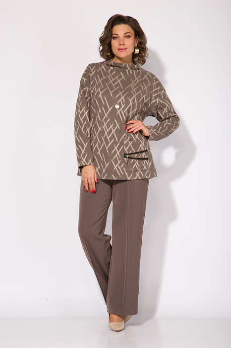 Костюм состоит из жакета и брюк. Жакет полуприталенного силуэта с застежкой на молнию. Воротник стойка. Рукав на спущенной линии плеча полной длины. По талии и низу рукава предусмотрена кулиску с утяжкой. По полочке расположены накладные карманы с клапаном. По бокам предусмотрены разрезы. В комплекте брюки прямого кроя с заутюженными кантами. Брюки на притачном поясе с круговой резинкой по талии. В брюках имеются боковые карманы.