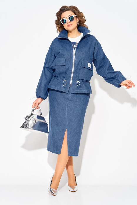 Модный и стильный юбочный женский костюм из денима с жакетом и юбкой — идеальный выбор для создания стильного образа! Жакет свободного силуэта, по типу «джинсовки» с застежкой на молнию.  Воротник-стойка, комфортно прилегает к горловине. Рукав длинный, на спущенном плечевом поясе.  Низ рукава оформлен на кулиску.  Полочка с накладными карманами с клапаном. Чуть ниже талии предусмотрена кулиска для комфортного и более плотного прилегания. Юбка в костюме длиной миди, слегка заужена к низу. Застежка-брючная тесьма-молния с обработанным гульфиком. Пояс притачной, в боковых участках вставлена резинка. В юбке предусмотрены боковые карманы, а также накладные карманы сзади. Фигурный разрез по центру привлекает внимание окружающих!