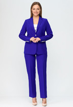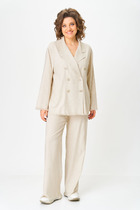 Шифоновое платье свободного силуэта на трикотажной подкладке. Горловина овальной формы. Платье отрезное чуть выше линии талии, на сборке. Рукав втачной. Низ рукава собран на эластичную тесьму. Жилет с нагрудными вытачками, отложными лацканами и двубортной застёжкой на петли и пуговицы. Спинка жилета с отлетной деталью. По низу жилета располагаются шлёвки с продетым в них съёмным поясом. Жилет на подкладке.