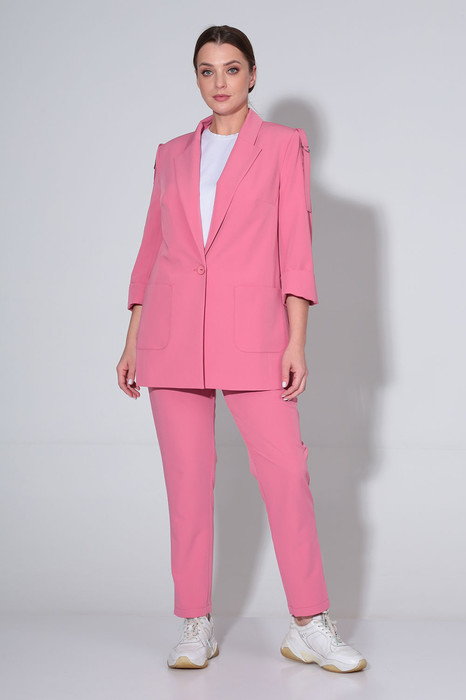 Жакет на подкладке. Прямого силуэта, с разрезами в боковых швах и накладными карманами закругленной формы. Застежка однобортная на одну пуговицу. По переду отрезной бочек, по спинке средний шов. Рукав втачной, длина 3/4. По низу рукава цельнокроеная манжета. Верхний край брюк на резинке, с протянутым шнуром из основной ткани.
