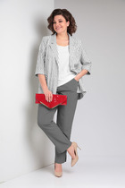 Комплект изготовлен из двух видов тканей. Жакет слегка приталенного силуэта с центральной бортовой застежкой на 3 петли и пуговицы. Воротник пиджачного типа с отложными лацканами. По переду обработаны прорезные карманы с листочкой. Рукава втачные двухшовные. Жакет на подкладке. Брюки к низу заужены, верхний срез брюк на притачном поясе, от середины передних половинок и по спинке вставлена резинка. По переду брюк имитация гульфика, по бокам карманы с наклонным входом.