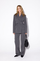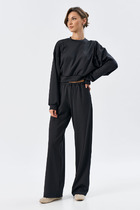 Жакет прямого силуэта со спущенной линией плеча. Воротник рубашечного типа на отрезной стойке. Центральная застёжка на петли и пуговицы. По переду отрезная кокетка с декоративными клапанами. По спинке так же отрезная кокетка. На уровне линии талии кулиса со шнуром из основной ткани, который фиксируется с помощью фиксаторов. По переду в нижней части полочек накладные карманы с клапанами. Рукав отрезной, низ рукава собран на эластичную тесьму. Брюки зауженные к низу. Верхний край брюк на притачном поясе, по спинке от боковых швов на резинке. Застежка брюк спереди по типу «гульфик». На задних половинках брюк накладные карманы, спереди карманы «хулиганы».