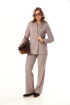 Комплект выполнен из костюмно-плательного материала.  Жакет на подкладке. Центральная застежка на петли и пуговицы. По переду наклонные карманы с листочкой в области талии. Спинка цельная. По низу жакета притачной пояс с резинкой, воротник отложной на цельнокроеной стойке. Рукава втачные одно-шовные, по низу на манжете с резинкой. Брюки прямого кроя на притачном поясе, от середины передних половинок и по спинке на резинке. Застежка брюк спереди по типу «гульфик». По бокам карманы с наклонным входом. Сзади накладные карманы.