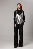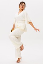 Блуза со стояче отложным воротником и центральной застёжкой на потайные петли, пуговицы и одну кнопку. Изделие со спущенной линией плеча. Рукава втачные, частично с застёжкой на кнопки.
