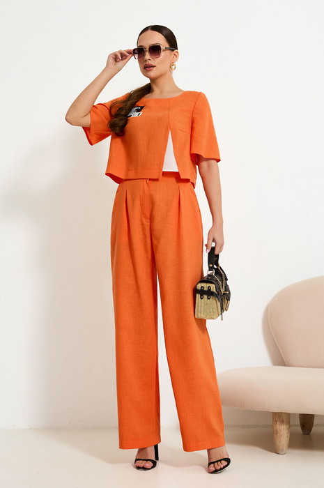 Молодежный  дизайнерский комплект с короткой  блузой и широкими брюками – тренд  этого года. Укорочена  блуза  прямого  силуэта  с декоративными нашивками, с ассиметричным подрезом и вставкой из отделочного матерьяла. Перед оформлен нагрудными вытачками из бокового шва, спинка без шва.   Рукава втачной,короткий. Горловина круглая. Прямые брюки  с отрезным поясом, с  резинкой по центру спинки. Карман с боковой частью. Застежка обработана по классической   технологии  (гульфик с молнией и пуговица на поясе).