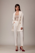 Жакет с фигурным вырезом горловины и центральной застёжкой на петли и пуговицы. Перед с карманами с листочками в нижней части. Изделие с отрезной деталью по горловине переда и с отделкой из контрастной по цвету ткани по ней. Рукава втачные. Жакет на подкладке.