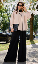 Жакет с фигурным вырезом горловины, фигурным краем борта и застёжкой на петли и пуговицы. Перед с накладными карманами в нижней части. Спинка со средним швом и талиевыми вытачками. Рукава втачные. По горловине, краю борта и низу изделия идёт декоративный кант. Изделие на подкладке.