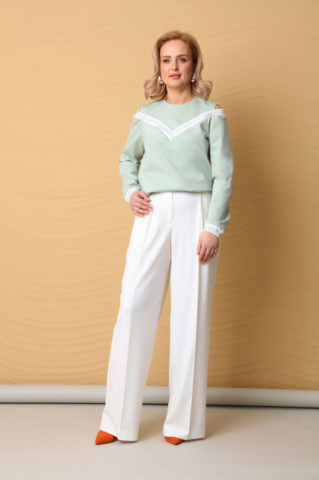 Комплект 2ка, состоящий из джемпера и брюк. Джемпер свободного объёма, оригинального кроя, с имитацией топа и открытыми плечами. Горловина круглая, по спинке застежка на петлю и пуговицу Отделка горловины джемпера и манжеты выполнены из довязов в контрастном цвете.  Брюки широкого объема, прямого силуэта. На передних половинках брюк заутюжены стрелки, переходящие в складки по линии талии. На задних половинках также заутюжены стрелки. В боковых швах расположены карманы. Застежка-гульфик. Пояс отрезной, притачной. В задней части пояса вставлена эластичная тесьма (резинка). На пояс настрочены шлевки. Выступающая часть пояса застегивается на петлю и крючок. Рост модели 170, размер 48.                    СОВЕТ ОТ СТИЛИСТА: из обуви отлично подойдут лодочки. Для образа "выходного дня" сделайте выбор в пользу кроссовок или кед.
