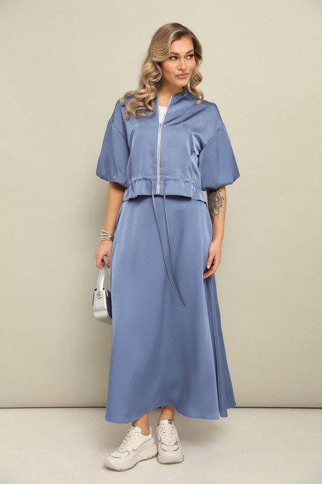 Комплект 2ка, состоящий из укороченного бомбера и юбки. Бомбер с застёжкой на молнию и объёмными рукавами. Линия талии на кулисе и завязке из основной ткани . Юбка кроя трапеция, длина макси. Длина юбки 90-92 см. Длина бомбера 48-49 см.