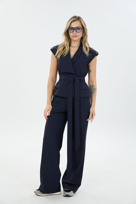 Комплект 2ка, состоящий из жилета и брюк. Жилет с отложным воротником и поясом. Перед жилета на запах с застёжкой на кнопки, на плечах декоративные паты. По бокам жилета выполнена имитация клапанов карманов. Брюки прямого силуэта на эластичной резинке по талии. По переду расположены карманы с наклонным входом.