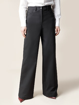 Комплект 2-ка, состоящий из укороченного бомбера и брюк. Бомбер с застёжкой на молнию и объёмными рукавами. Линия талии на кулисе и завязке из основной ткани.Брюки широкого объема, прямого силуэта. На передних половинках брюк заутюжены стрелки, переходящие в складки по линии талии. На задних половинках также заутюжены стрелки. В боковых швах расположены карманы. Застежка-гульфик. Пояс отрезной, притачной. В задней части пояса вставлена эластичная тесьма (резинка). На пояс настрочены шлевки. Выступающая часть пояса застегивается на петлю и крючок.