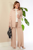 Комплект 2ка, состоящий из жакета и брюк. Легкий жакет на подкладке с объёмными рукавами. Перед на запах с застежкой на кнопки, под пояс по талии.