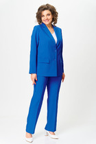 Комлект 2ка состоит из жакета и брюк. Жакет двубортный умеренного объёма из тёплой мягкой ткани. Застёжка на две пуговицы. По бокам расположены функциональные прорезные карманы с клапаном. Жакет на подкладке. Брюки широкого объема, прямого силуэта. На передних половинках брюк заутюжены стрелки, переходящие в складки по линии талии. На задних половинках также заутюжены стрелки. В боковых швах расположены карманы. Застежка-гульфик. Пояс отрезной, притачной. В задней части пояса вставлена эластичная тесьма (резинка). На пояс настрочены шлевки. Выступающая часть пояса застегивается на петлю и крючок.  Длина жакета по спинке 70-71 см. Длина брюк 110-114 см.